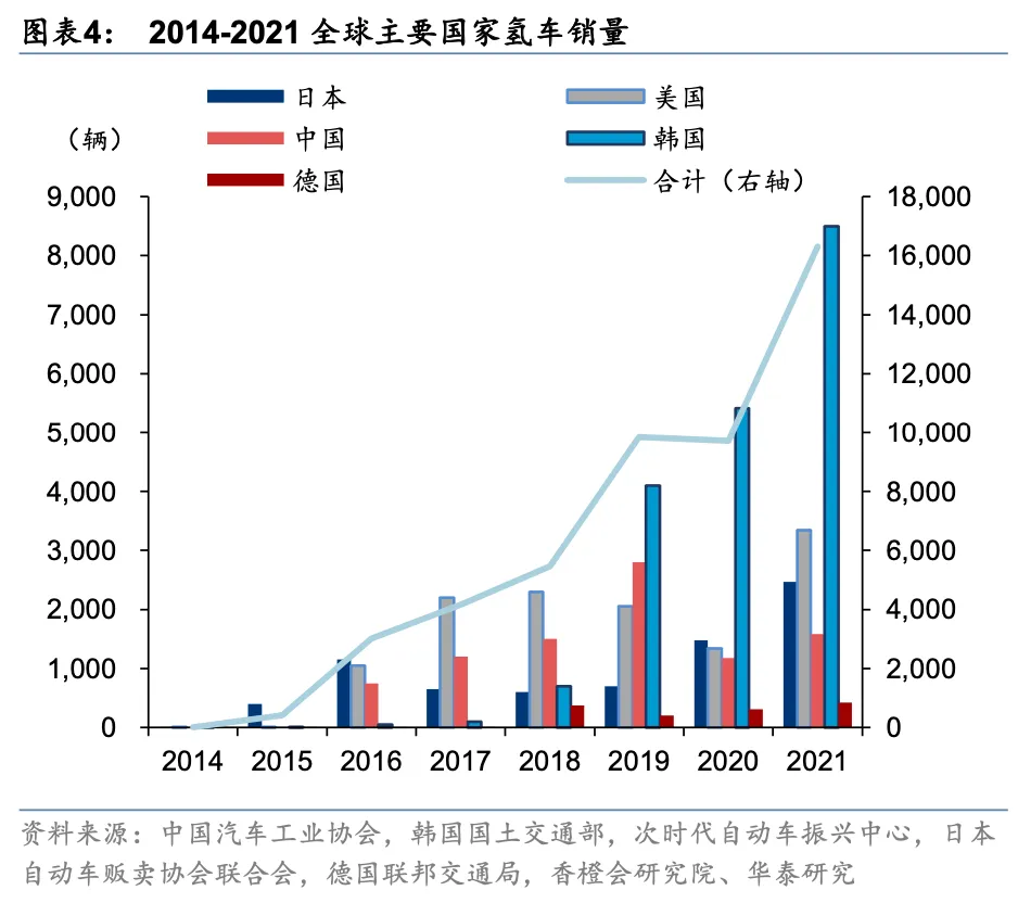 根据《中国氢能源及燃料电池产业白皮书(2020)》预测,2030年中国氢气需求量将达到3715万吨,2060年达到13030万吨。在2021年,全球氢燃料电池汽车的销售达16163台,其中韩国因为有强势政策补贴,销售的比例最高,占总销量的52%。其余国家地区的氢燃料电池汽车销量也有所提升,美国销量3314台,日本2464台,中国1586台。