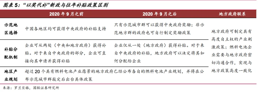 “以奖代补”。2020年9月,五部委联合发布《关于开展燃料电池汽车示范应用的通知》,取消“国补+地补”的补贴模式,转为由中央政府将政策奖励下发给城市示范群所在的地方政府,由地方自主制定并实施产业发展奖励政策,因地制宜发展氢燃料电池产业,要求示范城市群(北上广)在第1-4年间实现至少 2项、4项、5项、7项的本土化突破落地:可以通过发展燃料汽车获得积分,一个积分是10万元人民币,而积分上限是17000分,超额完成不超过上限的10%,也就是在以上三个城市,只要在“燃料电池汽车推广应用”、“关键零部件研发产业化”、“氢能供应(绿氢)”三个方面,完成积分任务,经过专家评审,最高能获得18.7亿元的补贴。