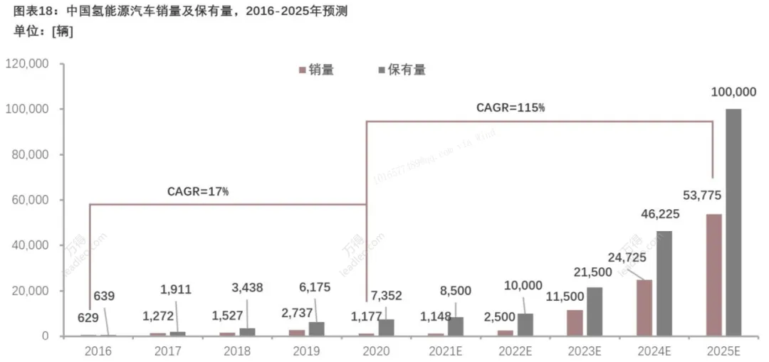 根据《中国氢能产业发展报告2020》,预计中国氢能源汽车保有量由2020年的7352辆增长至2025年的10万辆,CAGR高达115%,市场规模达到800亿元。目前国内政府主导氢能源汽车行业的发展,不断加大对客车、物流车辆的采购,预估在2030年前,客车、物流车是氢能源车规模增长的主要力量,在氢能源汽车保有量的占比将达到80%以上。2030年以后,随着燃料电池系统技术的成熟以及成本下降,重卡和乘用车的规模将快速扩大。