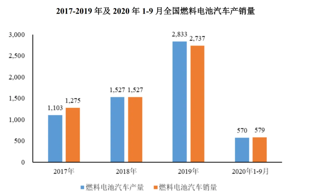 根据中国汽车工业协会的数据,2018-2020年,国内燃料电池汽车产量分别为1,527辆、2,833辆及1,199辆,销量分别为1,527辆、2,737辆及1,177辆。2020年,燃料电池汽车产销量出现了回落的现象,一方面是由于疫情的大环境所致,另一方面,考虑市场环境受到2020年9月国家发布的对氢燃料电池汽车行业示范应用“以奖代补”的补贴新政的影响。
