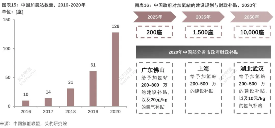 中国加氢站的核心设备主要依赖进口,设备成本占加氢站建设总成本的约70%,2020年中国加氢站数量达128座,预计至2050年达到10000座。