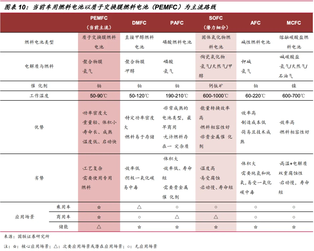 氢燃料电池优势在更高的功率和能量密度,在载重和续航方面有优势,而在加氢站等配套设施方面相较纯电车存在劣势;纯电车虽然续航能力有弱势,但是满足覆盖城市内的公交、物流车、环卫等短途行驶,也由于当前的成本优势,短期内城市内交通工具的纯电化会更加迅速。因此,从技术特性上,氢燃料电池汽车适用的应用场景主要包括固定路线、中长途干线、高载重: