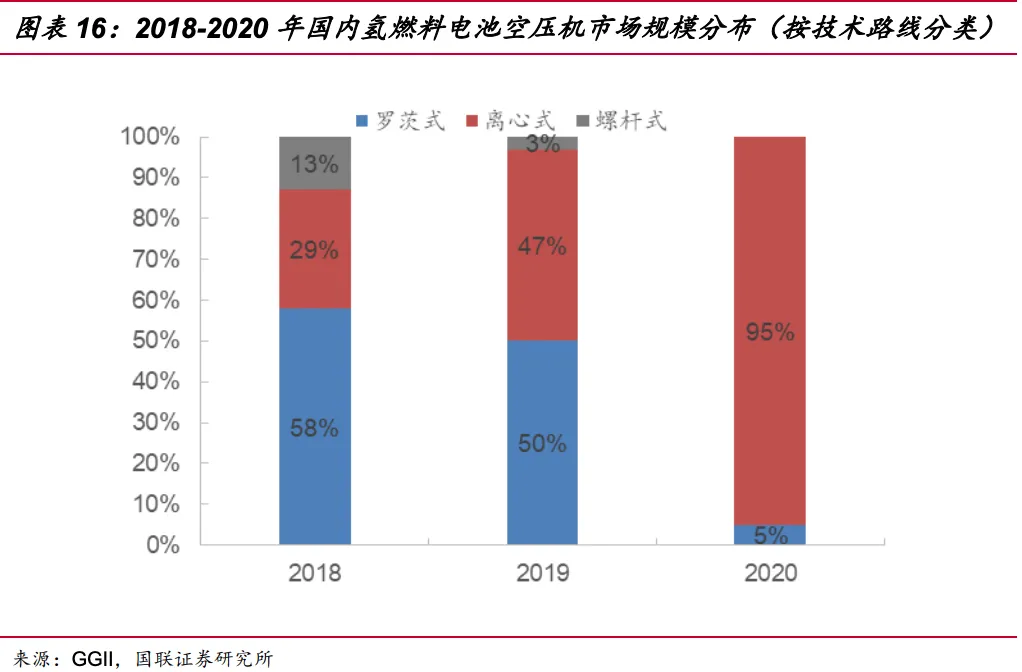 离心式空压机成市场主流技术路线。从技术路线来看,氢燃料电池用空压机类型主要有容积型空压机和速度型空压机,国内常用的氢燃料电池空压机主要有容积型罗茨式空压机和双螺杆式空压机、速度型离心式空压机三种。近三年来,离心式空压机成氢燃料电池空压机主流产品,国内离心式空压机份额由29%增长到95%,市场占比增长超3倍。
