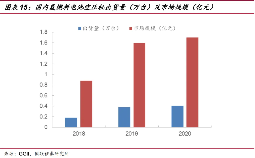 根据高工产研氢电研究所(GGII)调研数据,2018-202年氢燃料电池空压机出货量分别为1800台、3790台、4068台。