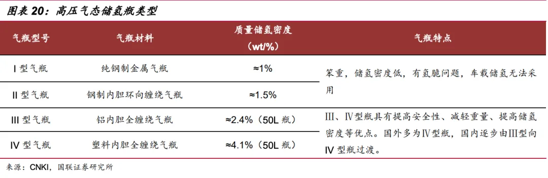 储氢系统是氢燃料电池汽车能量存储单元,目前主要有高压气态储氢及液态储氢两种车载储氢解决方案。技术成熟度方面,高压气态储氢最成熟、成本最低,是现阶段主要应用的储氢技术,国内氢燃料电池车储氢系统主要使用III型铝内胆35MPa储氢瓶,2020 年7月,涉及车载储氢系统的两项国标修改后正式实施,均将原范围中的工作压力不超过35MPa修改为70MPa,制约70MPa储氢罐发展的政策条件已经消除,IV 型 70MPa 的气氢储罐发展已经具备政策基础,我们预计未来3~5年内车用储氢系统仍然以高压气氢储罐为主,但将由III型 35MPa向IV型70MPa气氢储罐过渡。
