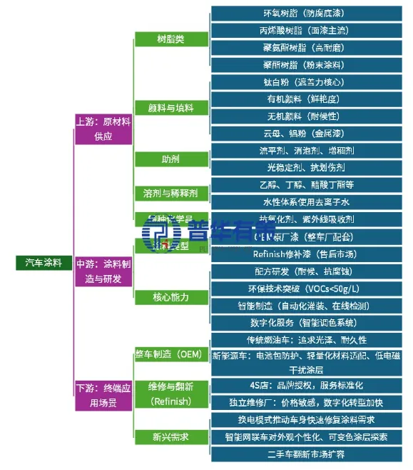 下游涵盖整车制造、汽车维修、新能源汽车及零部件等领域,其中新能源汽车的快速发展带动了对轻量化、功能性涂料的创新需求,而维修市场则向便捷化、数字化服务模式转型,整体产业链呈现绿色化、高端化、协同化发展趋势。