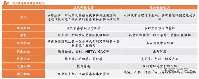 保健食品同时具有食品与药品双重属性,既具有食品的快消品属性,也与药品一样受更严格监管。我国保健食品大致可分为主要依据中医理论的传统保健品,和主要依据现代营养学和预防医学理论的现代保健食品。随着人们健康意识的觉醒,现代营养学和预防医学知识愈发普及,以此为基的现代保健食品受重视的程度不断加深。