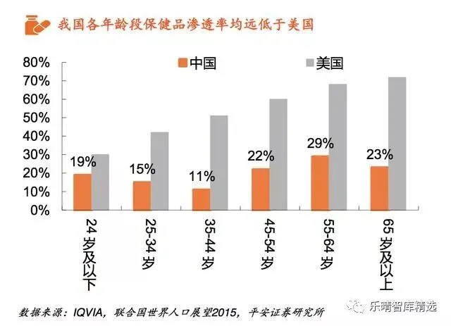 老龄化人口、亚健康城市人口&三四线城镇新增消费者,都是保健食品潜在消费人群我国保健食品整体渗透率约在20%左右,远低于成熟市场如日本的40%和美国的50%以上。