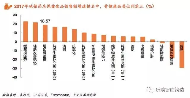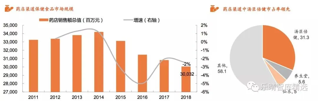 增速较慢,以中老年消费者为主线下零售药店是保健食品传统销售渠道,虽然受电商崛起的影响渠道销售额持续下降。但由于药店配备了专业的医疗或销售人员,具备一定公信力,因此仍是中老年消费群体购买药物和保健食品的主要渠道之一。目前汤臣倍健在此渠道占有领先地位,市占率超30%。