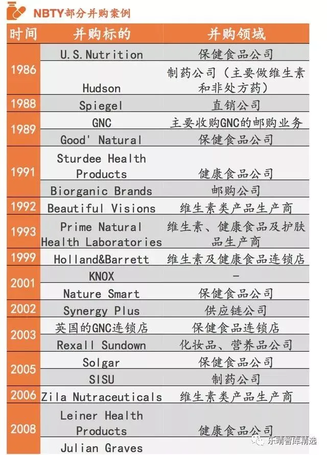美国行业龙头NBTY是保健品企业并购成长的先例。80年代中期开始,NBTY不断并购拥有渠道优势或能扩展自身产品线的公司,使公司销售额从90年代初的1亿美金大幅上升至2008年的超20亿。