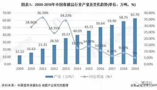 根据中国营养保健协会的数据显示,2009年至2019年保健品行业的敞亮在逐年上涨,增速在2012年小幅下滑后2013年有所回升,但是在2014年保健品产量增速大福下跌后呈小幅波动趋势,保持在10%左右。2019年中国保健品产量为62.7万吨,同比增速下落至5%。