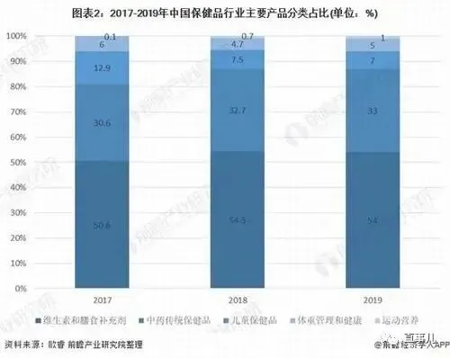 目前我国的保健品市场产品众多,但是还没有统一的产品分类。根据欧瑞对保健品市场的分类,可以将我国目前的保健品市场分成五个类别:维生素和膳食补充剂类,体重管理类,运动营养类,传统保健品以及儿童保健品。2019年中国保健品行业从规模占比看,维生素和膳食补充剂占据绝对的主导地位,占整个行业规模的54%。传统保健品行业规模占比逐年增加,由2017年30.6%增长到2019年的33%,排名第二。体重管理和运动营养类共保持6%左右的占比。