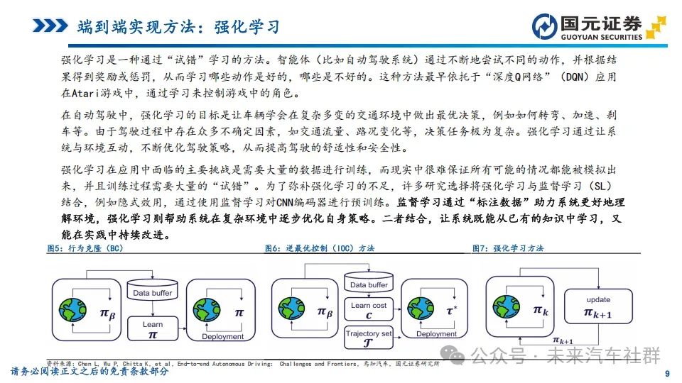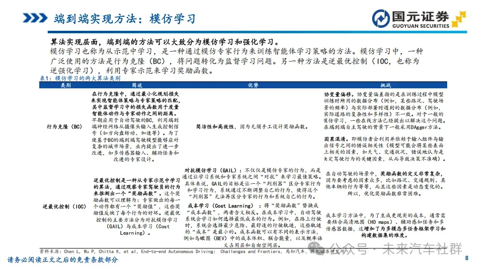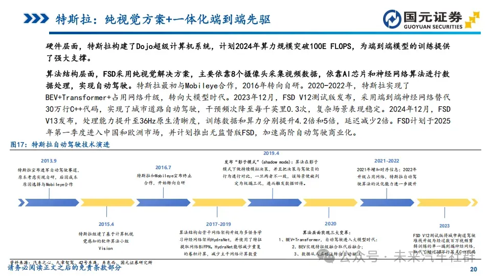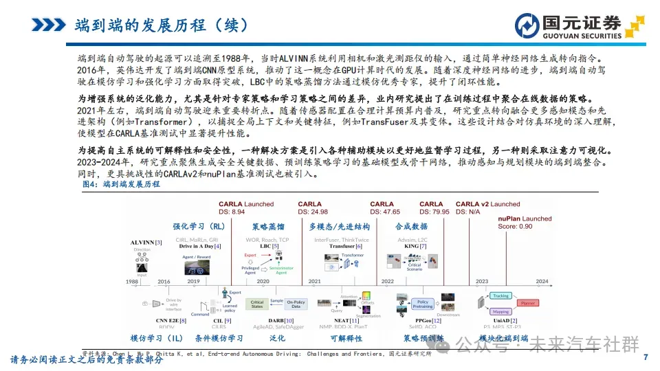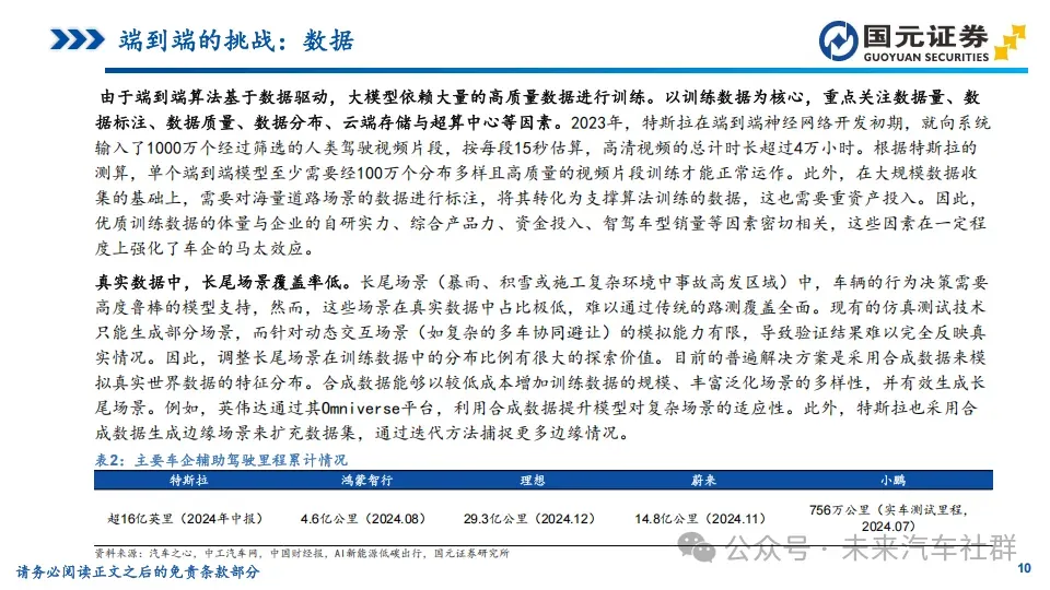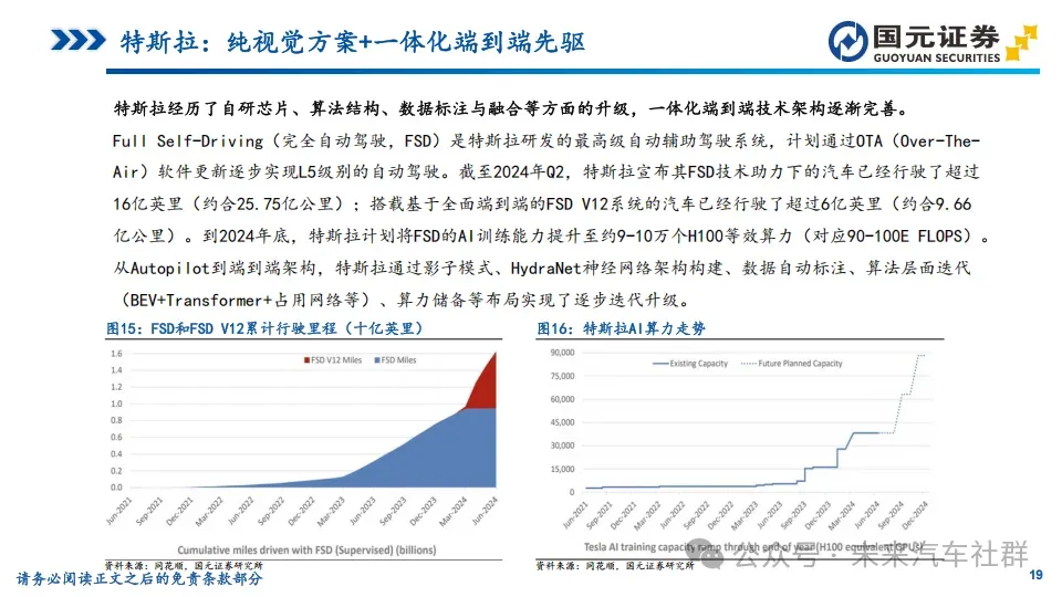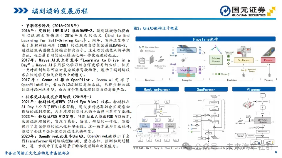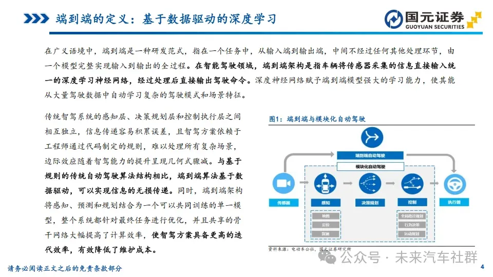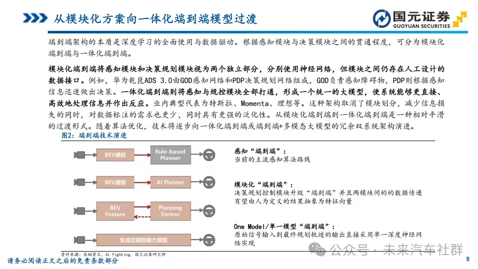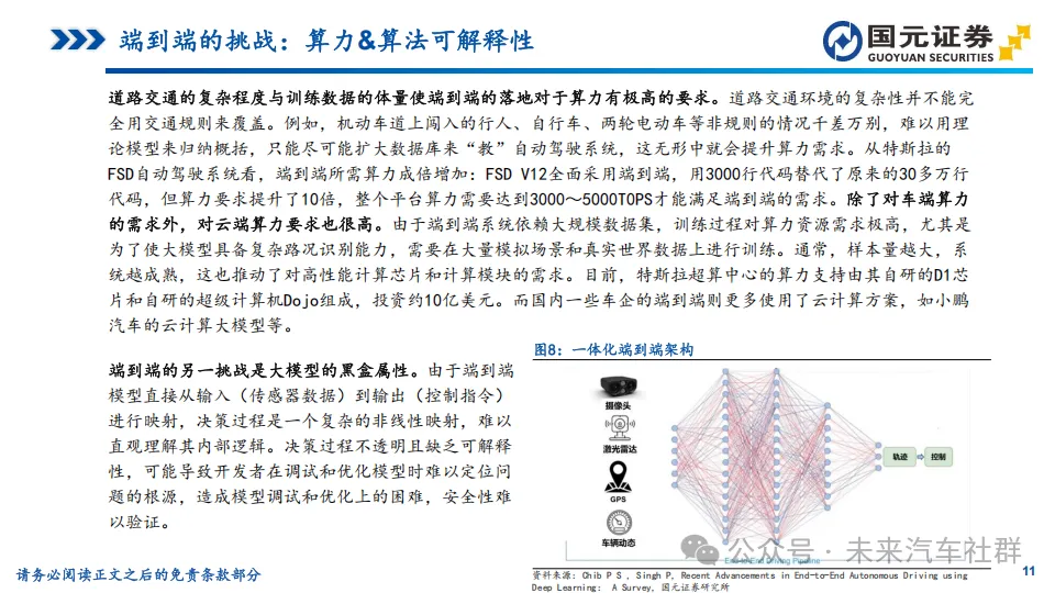 传统智驾系统的感知层、决策规划层和控制执行层之间 相互独立,信息传递容易积累误差,且智驾方案依赖于 工程师通过代码制定的规则,难以处理所有复杂场景,边际效应随着智驾能力的提升呈现几何式骤减。与基于规则的传统自动驾驶算法结构相比,端到端算法基于数据驱动,可以实现信息的无损传递。同时,端到端架构将感知、预测和规划结合为一个可以共同训练的单一模型,整个系统都针对最终任务进行优化,并且共享的骨干网络大幅提高了计算效率,使智驾方案具备更高的迭代效率,有效降低了维护成本。
