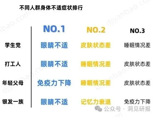 由于电子产品使用时长较长,“眼睛不适”已成为多数人群的健康因扰之一。在青年群体中,睡眠情况差、皮肤状态差也成为其主要健康问题。在工作与育儿的双重压力之下,年轻爸妈则更为关注“免疫力下降”问题。