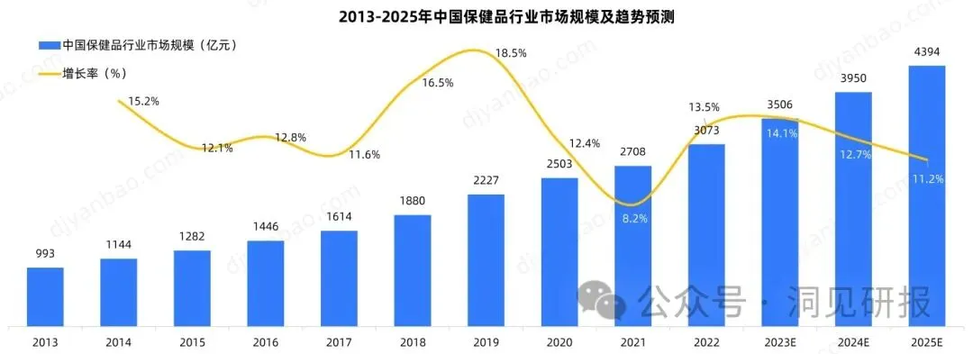 未来行业虽难以复制以往高增长态势,但整体规模仍将稳步增长,预计至2025年中国保健品市场规模将达到4394亿元。