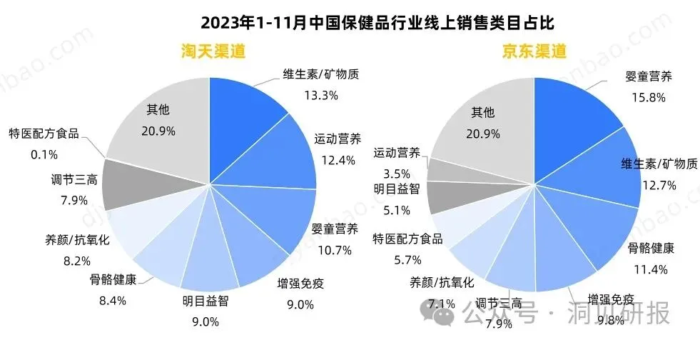 再看,中国保健品线上销售类目分布情况,整体较为稳定,综合淘天与京东渠道销售情况分析,虽然各渠道类目排名不尽相同,但维生素/矿物质与婴童营养等传统保健品类目占比始终较为靠前。