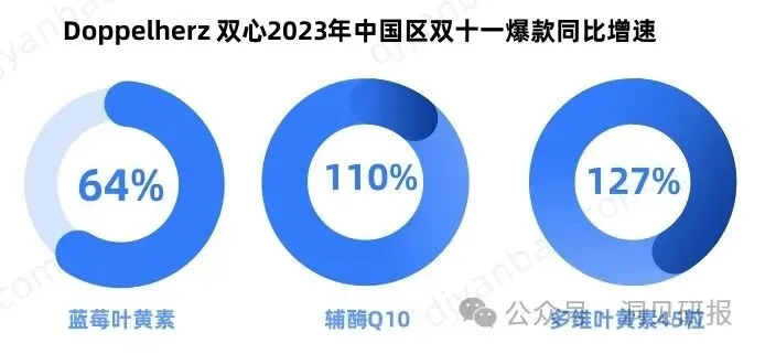 2023年双十一,Doppelherz 双心全网 GMV 突破1.5亿元,同比增长超过40%。爆款增长明显,蓝莓叶黄素、辅酶Q10、多维叶黄素45粒销量同比分别增长64%,110%,127%。