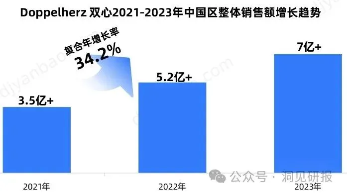 除双十一大促外,Doppelherz 双心整体表现也十分耀眼。从2021年的3.5亿元增长至2023年的7亿元,复合年增长率超过34%。