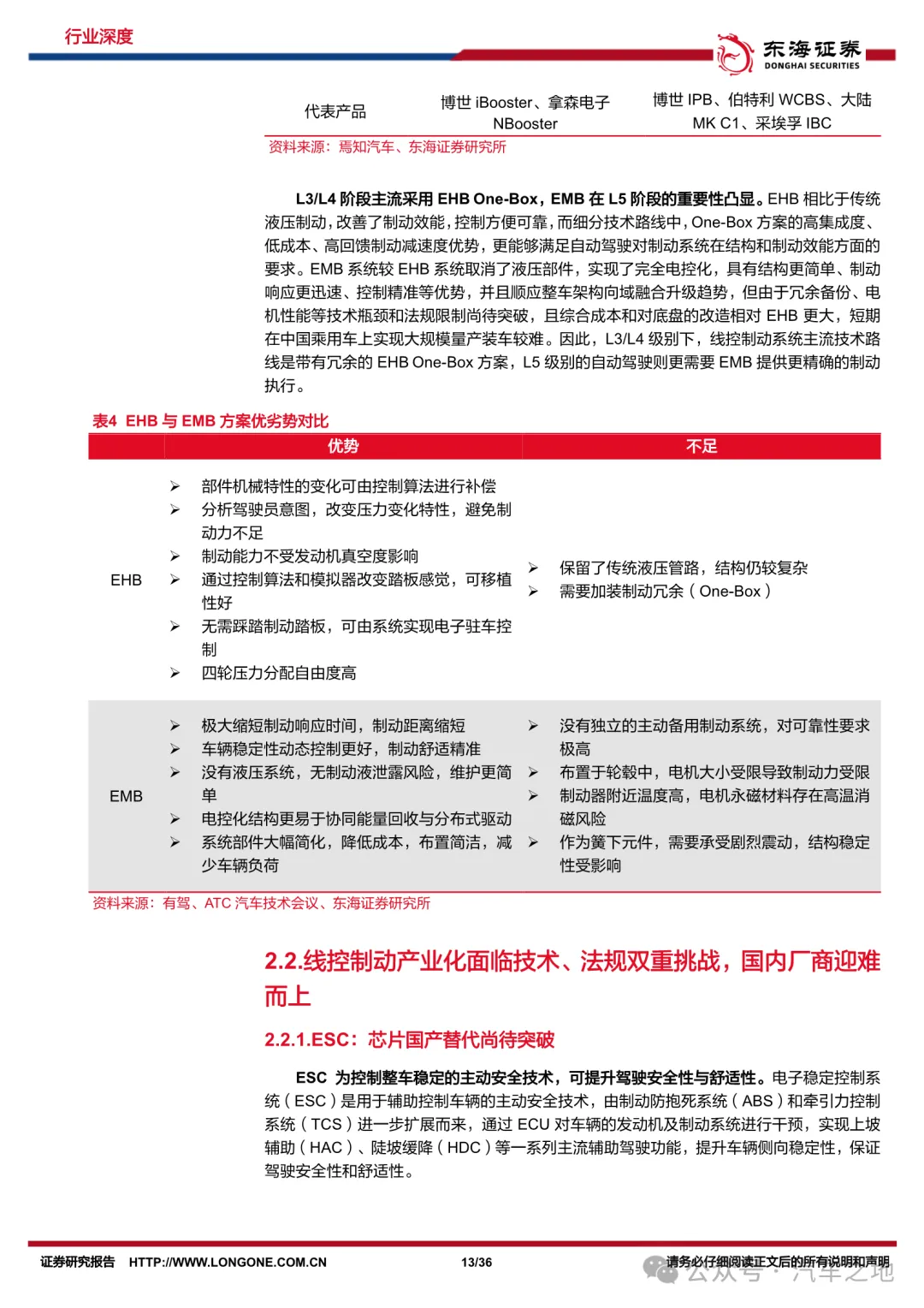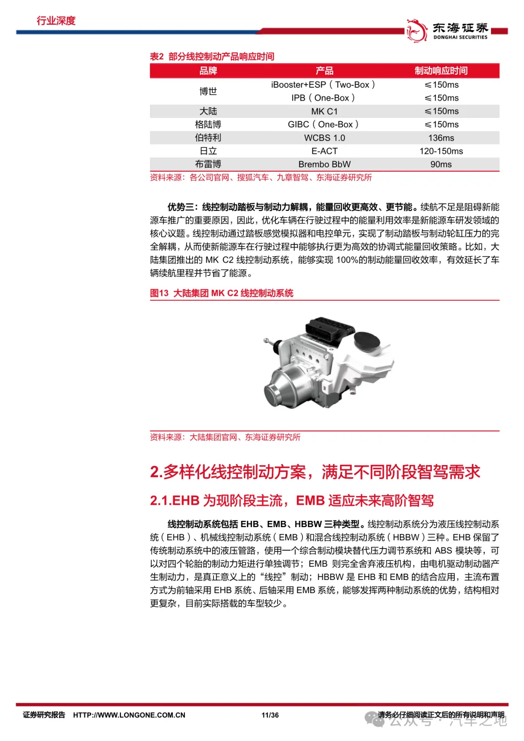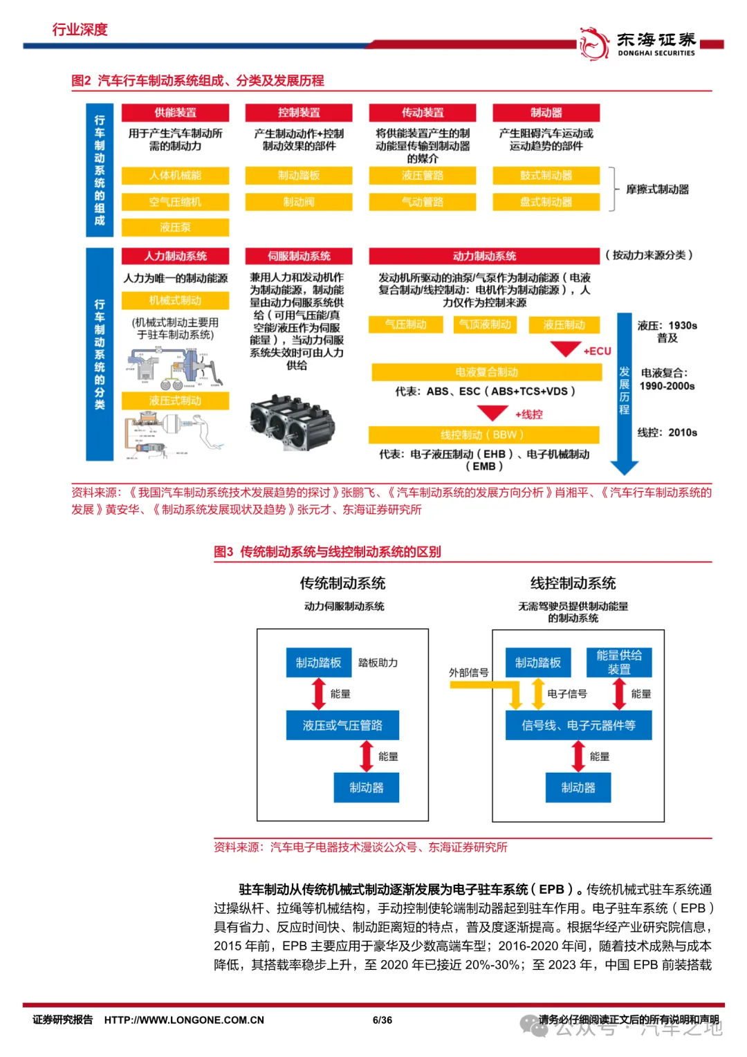 线控制动主要包括EHB、EMB和HBBW三大类。汽车制动系统分为驻车制动和行车制动两大主要类型。其中,驻车制动主流方案为集成式EPB。行车制动系统由纯机械制动、液压制动、电液制动系统向线控制动发展,而线控制动可分为液压式线控制动系统(EHB)、机械式线控制动系统(EMB)和混合式线控制动系统(HBBW)三种,EHB按照电子助力器是否集成ABS/ESC系统,可进一步细分为Two-Box方案和One-Box方案。