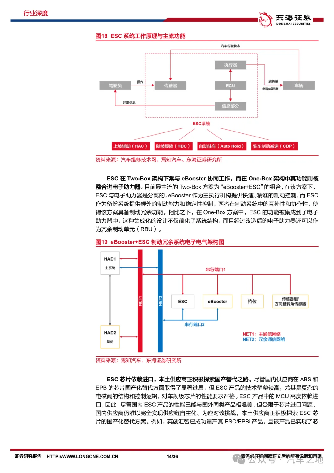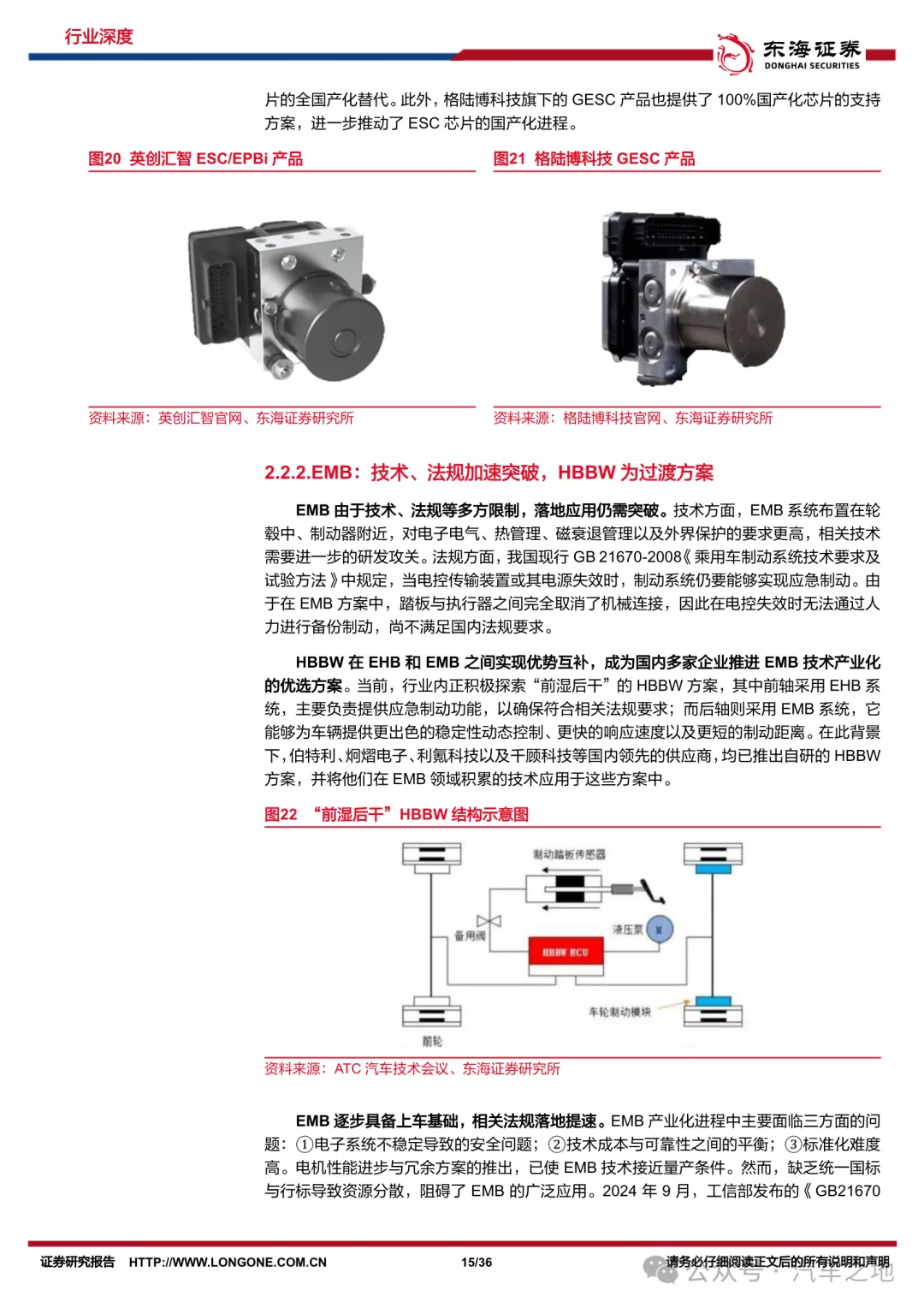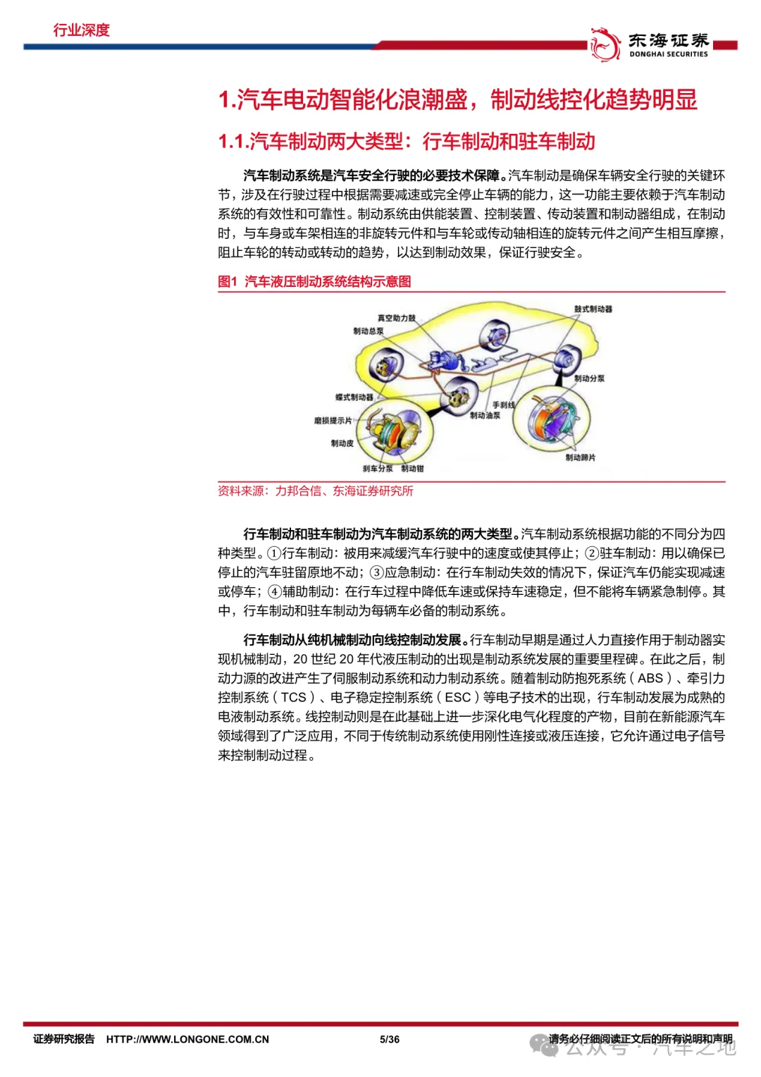 线控制动主要包括EHB、EMB和HBBW三大类。汽车制动系统分为驻车制动和行车制动两大主要类型。其中,驻车制动主流方案为集成式EPB。行车制动系统由纯机械制动、液压制动、电液制动系统向线控制动发展,而线控制动可分为液压式线控制动系统(EHB)、机械式线控制动系统(EMB)和混合式线控制动系统(HBBW)三种,EHB按照电子助力器是否集成ABS/ESC系统,可进一步细分为Two-Box方案和One-Box方案。