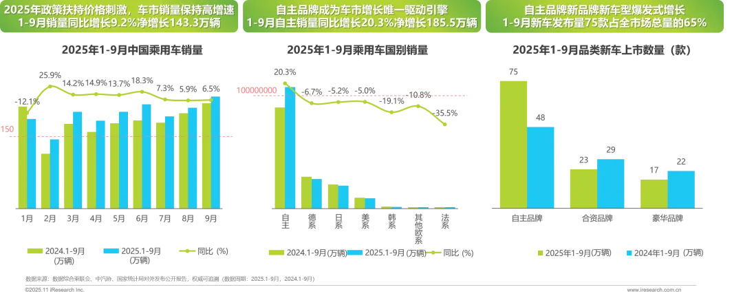 2025年1-9月自主品牌销量同比+20.3%净增长185.5万辆,驱动车市+9.2%高速增长,从中国车市历史以来的“合资引领,自主跟随”局面,在今年彻底颠覆