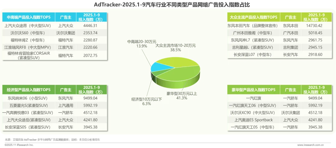 豪华型30万元以上汽车广告投入指数占比达41.3%,大众主流市场10-20万元汽车占比38.5%