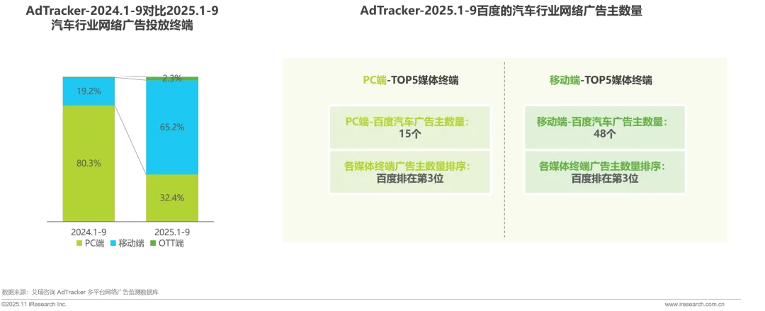 汽车广告投放终端结构发生变化,移动端广告投入占比大幅提升,OTT端略有增长。百度在PC端、移动端的汽车行业广告主数量位列前三