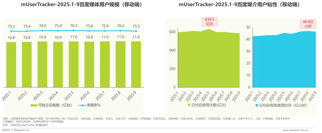 11亿+移动互联网用户在使用百度生态的APP,占整体用户粘性持续巩固