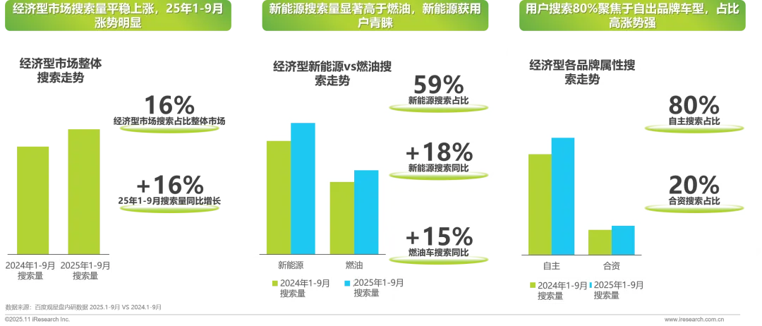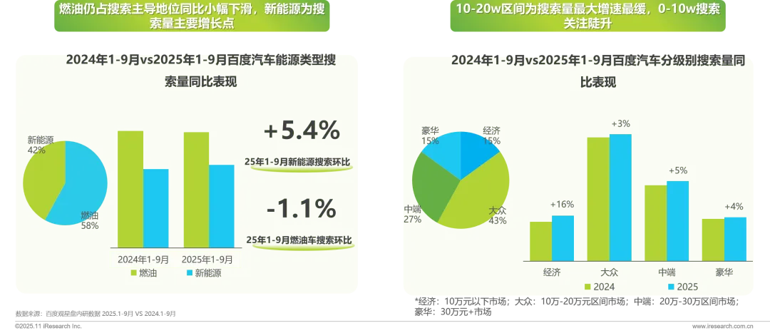2025年新能源搜索量持续增长,搜索量占比增长2%,燃油车搜索关注逐渐回暖,同比降幅收窄受价格战持续影响,10w以下市场用户搜索频繁,同步+16%;而10-20w区间受合资影响下降因素,同比搜索涨幅最低