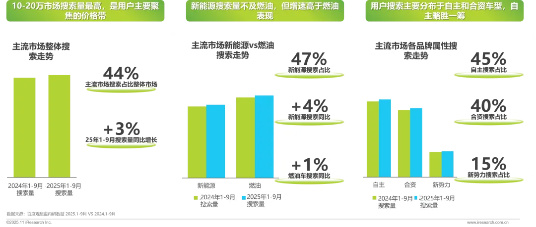 主流大众市场是用户最关注的价格分区,用户搜索量最高,燃油搜索量高于新能源,自主关注度略胜于合资