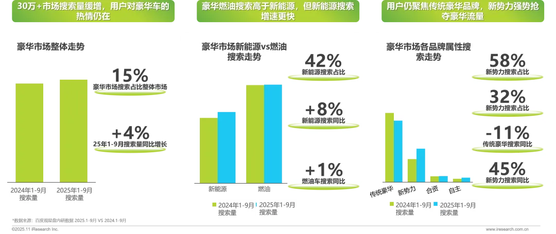 30万元+市场搜索量缓增,用户搜索主要聚焦传统豪华车型,但被新势力的强势抢夺