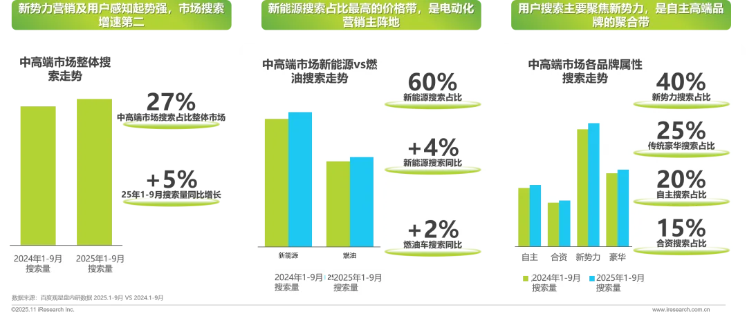 中高端市场是新能源搜索占比最高的价格分区,是新势力兴趣人群的主要聚合带,电动化营销的主阵地