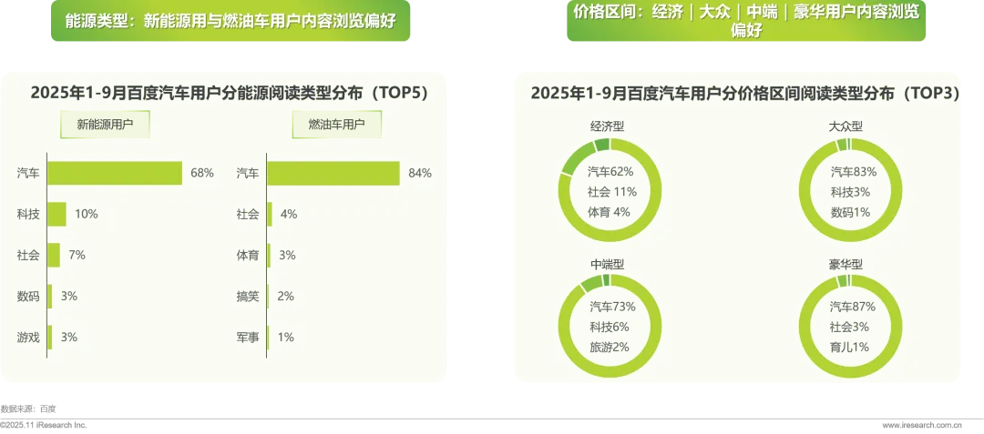 百度汽车用户偏好阅读汽车类型内容,对看选购用车内容了解意图明显,新能源用户泛内容兴趣偏向科技数码