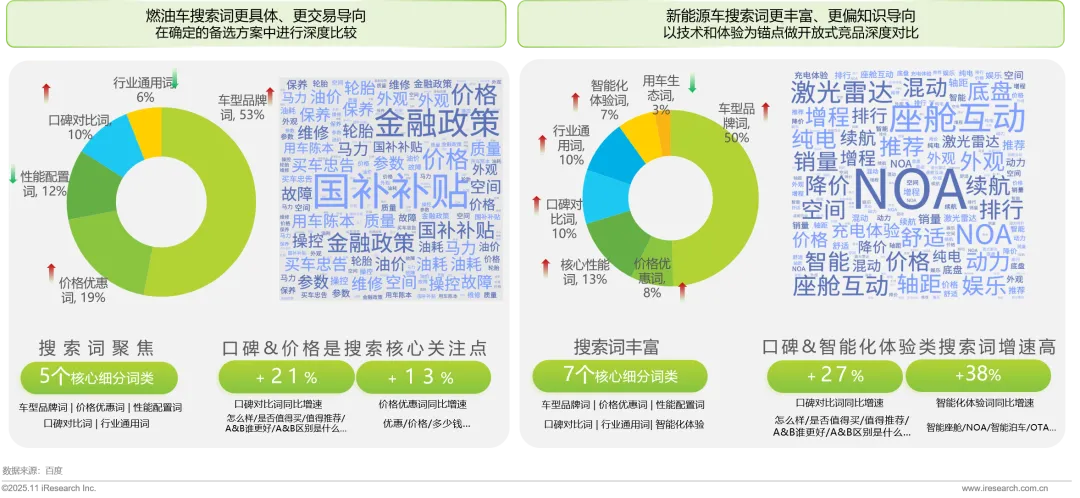 · 用户搜索更加多元,新能源车搜索行为更广泛复杂,口碑对比类及智能体验类搜索词影响力加深