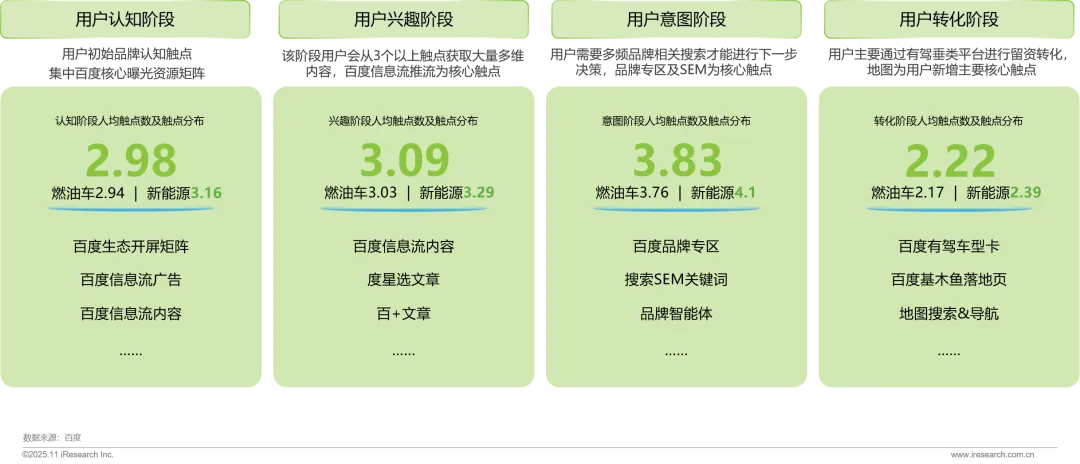 意图人群人均触点数最高,需要更多搜索生态触点布局及运营;新能源用户会通过更多触点辅助决策