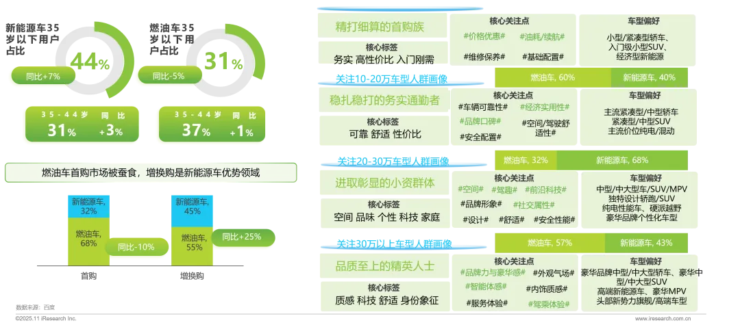 年轻圈层与增换市场驱动新能源增量空间,中年群体与首购市场购车需求是维护重点