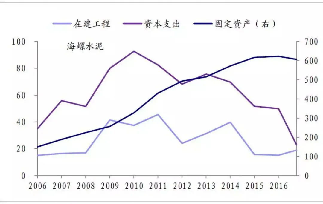 以A股市场较为典型的周期行业龙头公司海螺水泥为例,其资本支出、在建工程、固定资产三个会计科目的演变路径如下图所示,海螺水泥的资本支出(这里指现金流量表中的购建固定资产、无形资产和其他长期资产所支付的现金)顶点在2010年出现之后,在建工程与资本支出的变化基本同步。固定资产科目是资本支出和在建工程科目的一个滞后变量,海螺水泥公司固定资产的顶点在2016年已经出现,考虑到当前在建工程金额已经降低到了一个非常低的水平,预计后续公司固定资产金额会逐步减少。