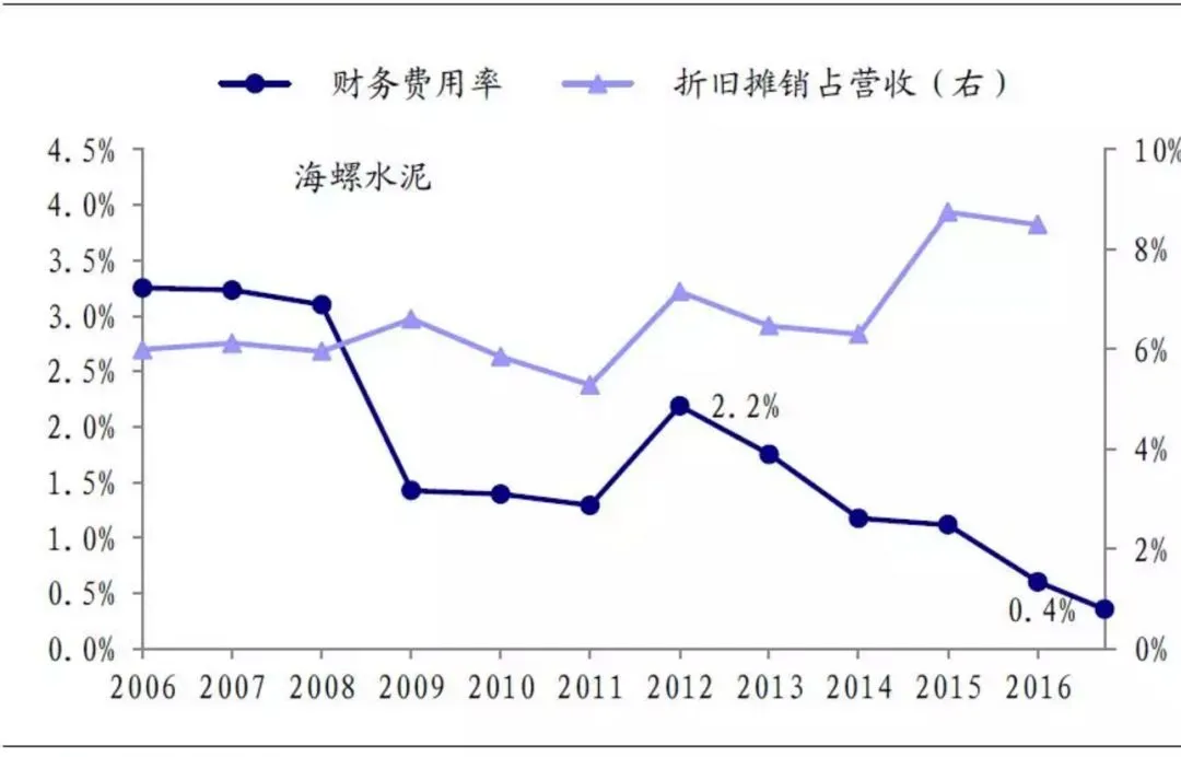 螺水泥资本支出的这种变化,对企业利润表的影响就是,我们看到从2013年开始公司的财务费用出现了显著减少。2012年海螺水泥全年财务费用为10亿,到2016年已经降低到了2.4亿,等于贡献了近7.6亿的利润。从财务费用率来看(暨财务费用占营业收入比例),2012年公司财务费用率为2.2%,到2017年三季度这个数字已经降低到了0.4%,意味着销售净利率提高1.8%。这部分是已经实现了的。