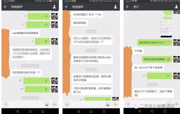瓜子通过中间人向阿里放风:腾讯确定投资瓜子,并出了 TS(投资意向书)。 又通过中间人向腾讯放风:阿里确定投资瓜子并占股 10%,也出了 TS。 同时,还对外界释放“消息称瓜子完成新一轮 10 亿美金融资”。 实际上,阿里是大搜车的战略投资方,我问了阿里得到的答案是:完全没有“出了TS”这回事。