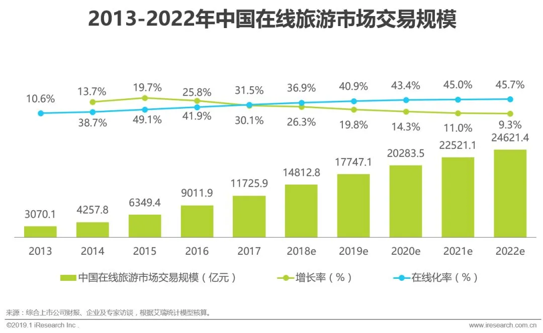 中国整体旅游行业规模体量较大,已保持每年稳定增长,与此同时,随着供给需求两端的互联网化程度均迅速提升,旅游的在线化率将持续快速提升。在目前旅游各细分市场中,机票火车票市场的在线化程度已达到较高水平,住宿和度假仍有较大发展空间。