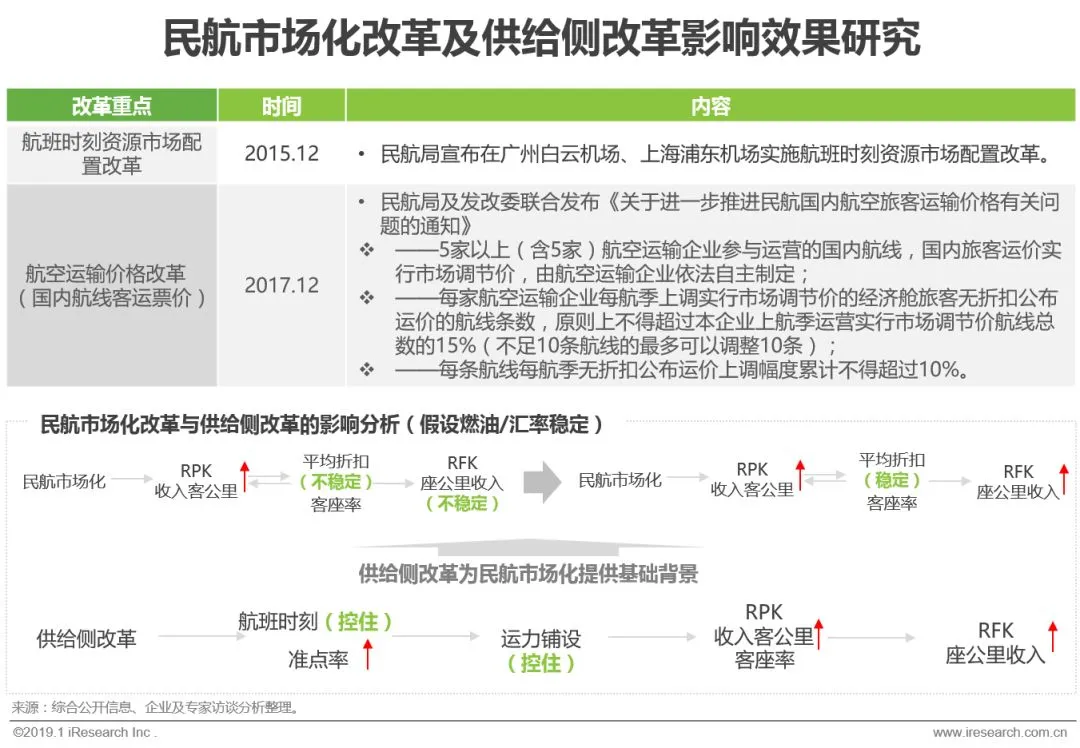 根据中央基本指导方向,民航局致力于以供给侧改革的理念推动航班时刻资源实现最优化配置,构建科学合理的航班时刻结构并进一步提高航班时刻资源使用效率,如在2015年12月宣布进行航班时刻资源市场配置改革的试点工作。在此基础上,2017年12月深化民航市场化改革,此次主要对国内民航客运价格进行市场化改革;国内客运机票价格为“明折明扣”,过去全价票价格主要基于民航局每期指导方案,在市场化改革后,部分航线全价票可由航司自主定价,机票价格更尊重市场,由市场供需影响更多。通知发布后,市场化后的航线票价调整在2018年暑运之前已基本完成。