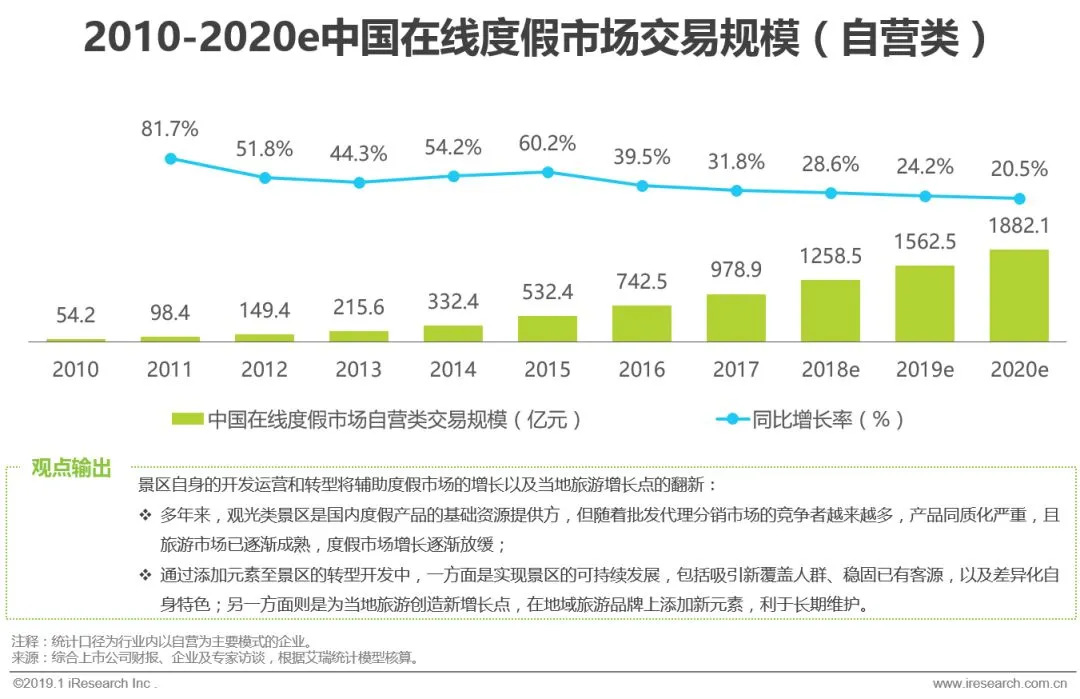 2017年中国在线度假市场自营类交易规模为978.9亿元,较2016年增长31.8%。艾瑞分析认为,随着居民生活水平的提高,其度假意愿将会进一步上升,预计在2020年,中国在线度假市场自营类交易规模将超过1800亿元。