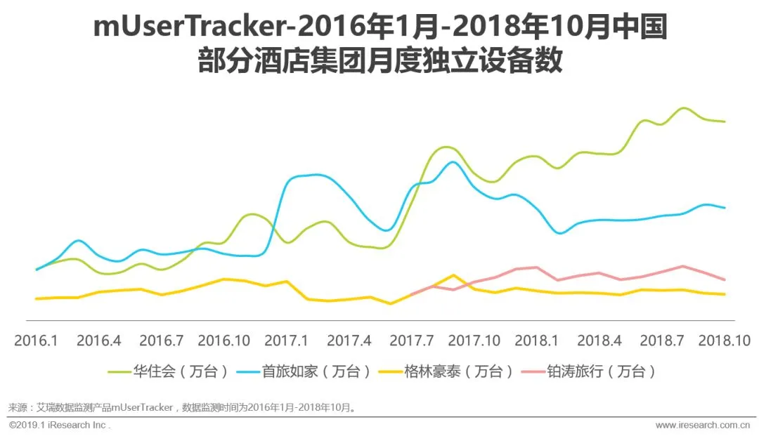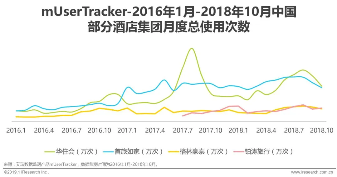 艾瑞监测数据显示,从2016年开始至今,酒店集团的月度独立设备数及月度总使用次数均随时间变化有明显增长,代表酒店集团在直销渠道建设上的投入有明显成效。