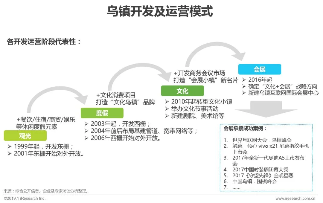 目前看来,乌镇景区是一份完整且优秀的景区开发运营模式的代表性作品。其基础是乌镇的水乡观光古镇资源,在此开发基础上,为景区配套餐饮/住宿/商贸/娱乐等基本元素,但仅有观光属性的景区持续发展风险性较大,因此为其添加度假元素,在多年前即建设宽带网络、基建等基础休闲度假设施;后添加文化元素,打造“文化乌镇”品牌,实现属性的增加;近年来为维持旅游淡季时期景区的高效运营,开发景区的会展服务属性,实现多重点发展,完成自身属性的升级。