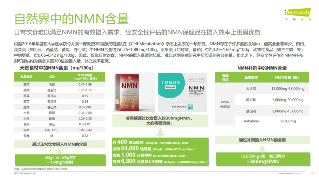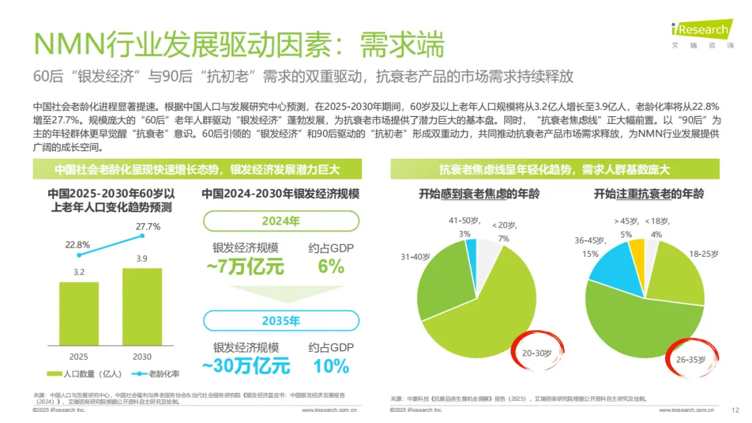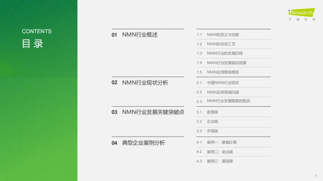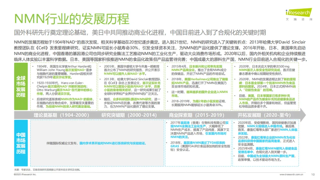 《2025年中国NMN行业研究报告》系统梳理了NMN行业的发展现状、驱动因素、应用场景及未来趋势。NMN作为人体内NAD+的直接前体,具有抗衰老、修复DNA、调节代谢等核心功能,其合成工艺已从化学合成法逐步升级为全酶法、磁酶法等,纯度更高、更安全环保。全球范围内,美国、日本、澳大利亚等主要市场已确认NMN合法地位,中国虽尚未将其纳入药品或保健食品范畴,但2022年已通过化妆品新原料备案,2025年4月NMN被列入保健食品审批受理名单,合规化进程稳步推进。行业发展受多重因素驱动,人口老龄化催生的“银发经济”与年轻群体“抗初老”需求形成双重拉力,全酶法等技术突破实现成本下降与纯度提升,政策端的积极信号也为行业发展注入动力。当前中国已成为全球最大NMN原料生产国,市场规模稳步增长,预计2025年突破30亿元,产品主要通过跨境电商和品牌私域渠道销售,核心应用于保健品和化妆品领域,未来有望向宠物营养、医疗健康、农业科技等领域拓展。行业发展仍面临夸大宣传、消费者认知不足、技术迭代压力等挑战,关键突破点在于政策端合规化推进、企业端全产业链布局与商业模式创新、市场端科学验证与教育普及。康盈红莓、金达威、基因港等头部企业通过技术创新、产业链布局与合规布局确立竞争优势,为行业规范化发展奠定基础。