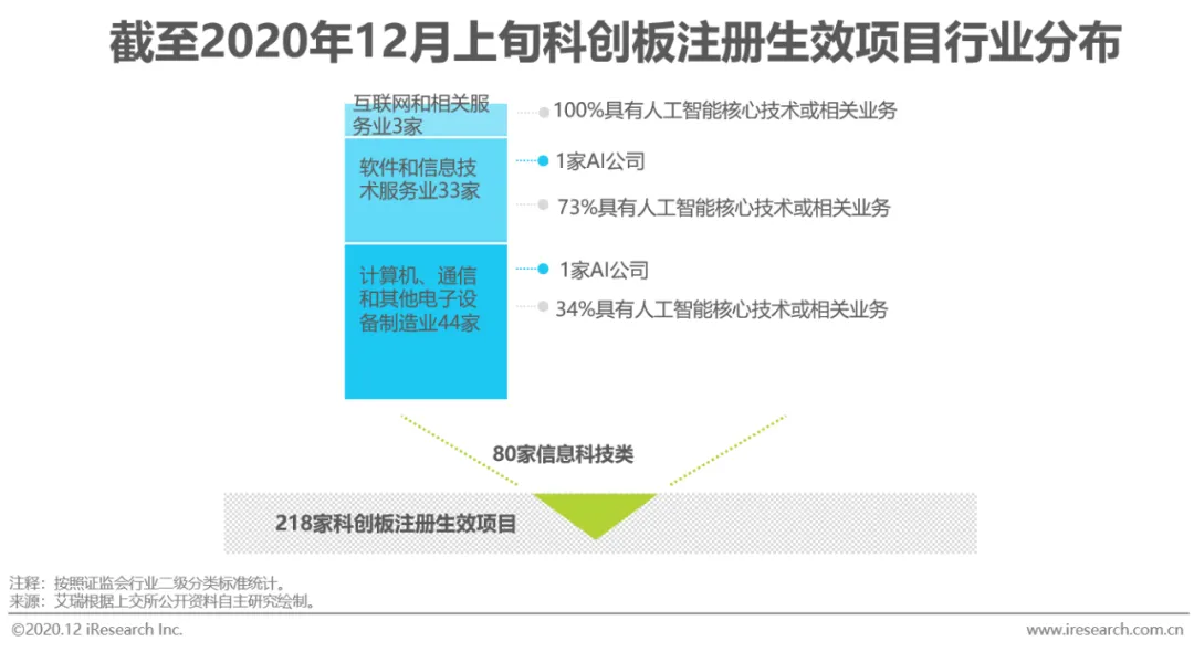 上市企业数量与表现是衡量一个行业发展情况的风向标。截至2020年12月上旬,科创板已注册生效的80家信息科技类公司中,2家为人工智能公司,42家(53%)披露具有人工智能核心技术或相关业务,这些公司主要来自地理信息技术、IT软件/运维/信息化、网络及内容安全、云服务、半导体设计、物联网及智能硬件、金融科技等赛道。已上市的人工智能公司在市值方面都取得了令人瞩目的表现。