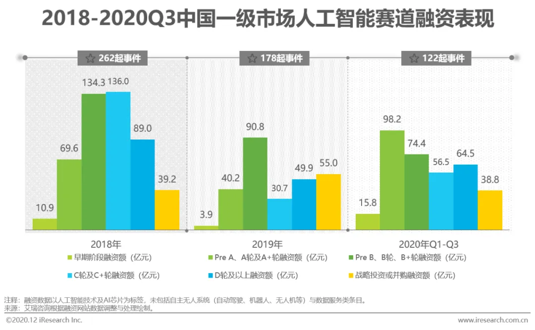 根据清科研究中心《2020中国科创企业展望报告》,超过68%的投资机构在2020-2021年将AI作为重点投资领域。艾瑞统计发现,2018年,资本市场对AI创企抱有极高的热情,虽2019年有所回落,但截至2020年Q3的33个月内AI依然吸收一级市场超千亿元资金。B+轮之后的项目融资额占比逐年回落,侧面也反映出近一两年市场上还未出现新一批独角兽。