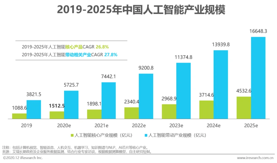 2020年,人工智能预计达到超过1500亿元规模,疫情环境下,2020年的业务高速增长主要由AI开放平台API贡献,除此之外的增长动力将在第四章详细阐述;到2025年,产业规模预计超过4500亿元。