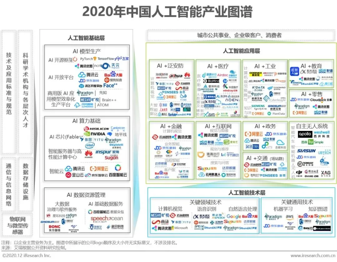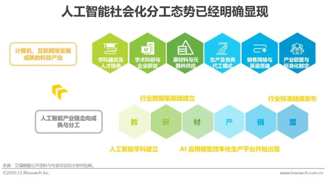 2020年开始出现人工智能产业链走向成熟与分工的信号:《国家新一代人工智能标准体系建设指南》印发;新一代人工智能开放创新平台陆续发布;AI 应用模型效率化生产平台开始出现;各行业推动高质量的适度规模的数据集建立,减少基础性重复投入;人工智能学科走进各级学校,从K12到职教、高教均有覆盖。人工智能本身的“基建”层崭露头角,从早期朴素的、“小农式”的算法开发,走向效率化、工业化生产,社会化分工态势已经明确显现。
