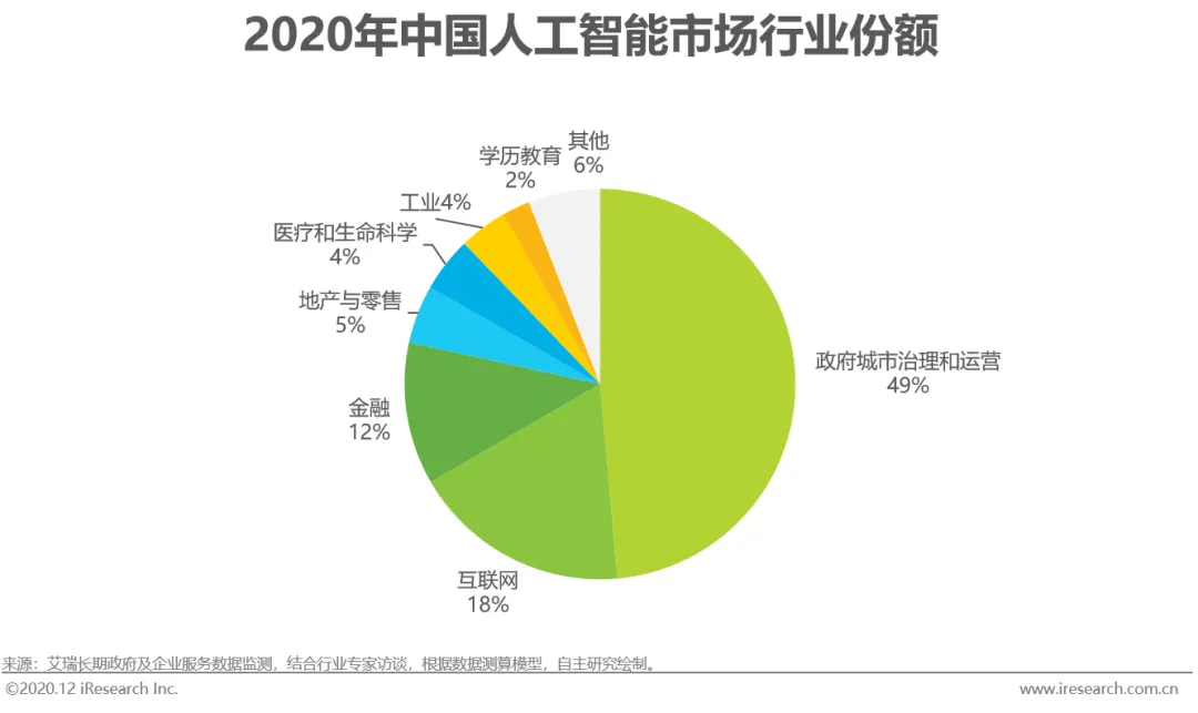 2020年,中国人工智能市场主要客户来自政府城市治理和运营(公安、交警、司法、城市运营、政务、交运管理、国土资源、监所、环保等),互联网与金融行业也位居前列。预计未来五年,这一行业格局分布会发生一定变化,主要动因来自人工智能核心技术赛道增速有差异、不同行业对人工智能的应用节奏发生变化,将在本报告商业分析版第四章节呈现。
